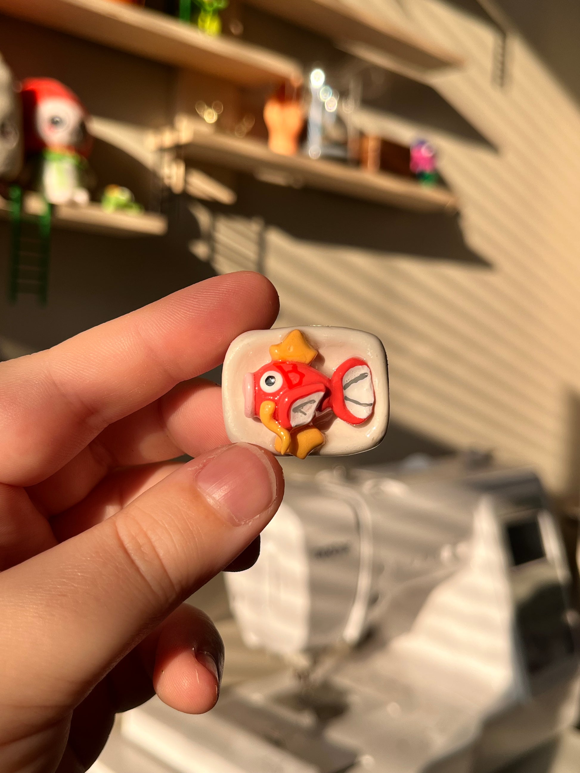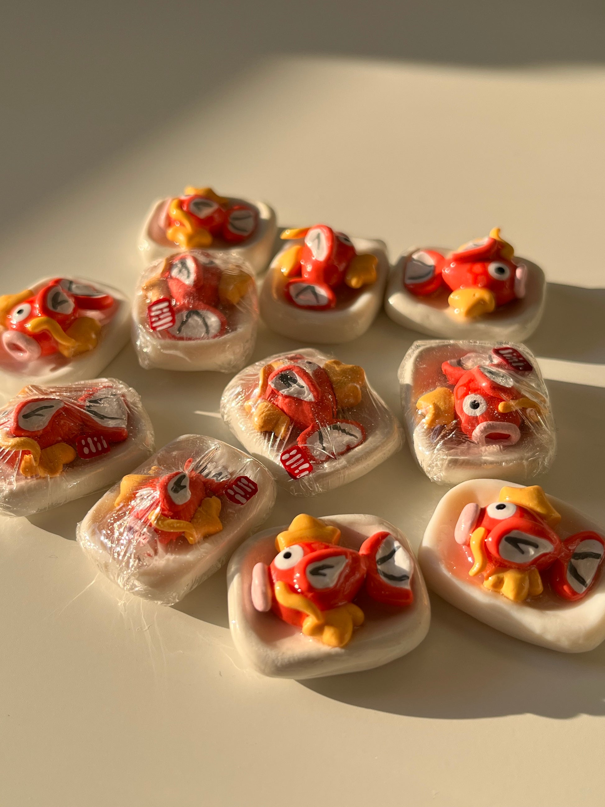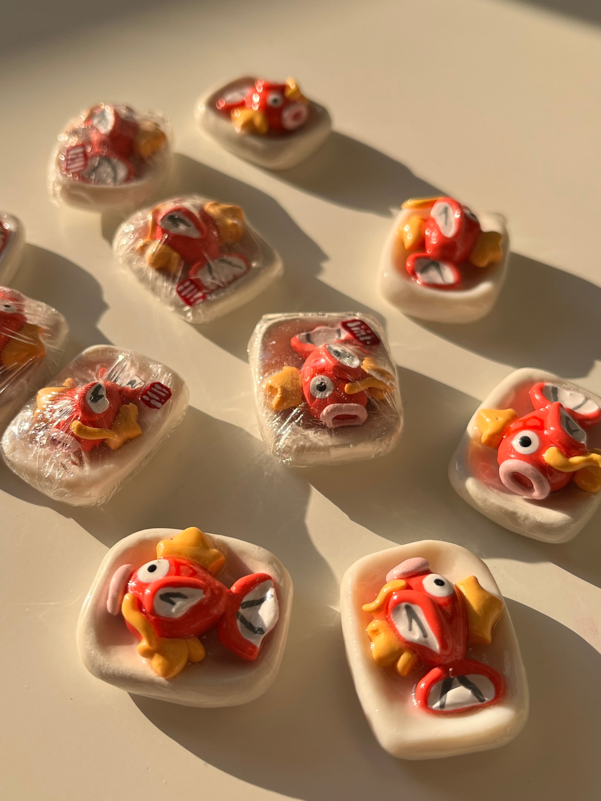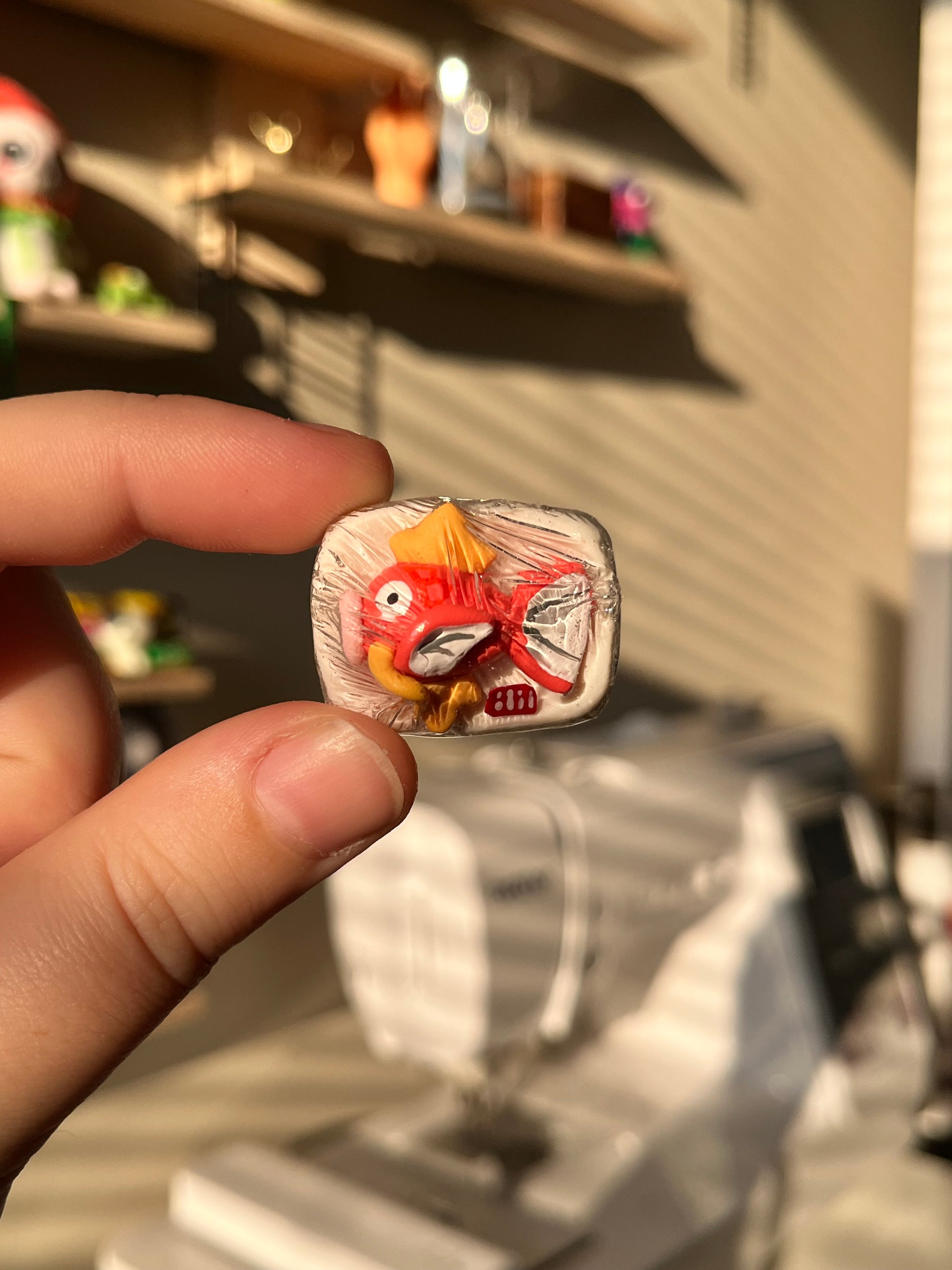 This handmade polymer clay mini features a tiny orange “carp” displayed on a little white platter, styled just like the fresh fish you’d see at a market stall—but with a whimsical twist. Sealed for durability, it’s the perfect collectible for fans of quirky minis, foodie art, or anyone who loves a playful nod to their favorite fishy friend.